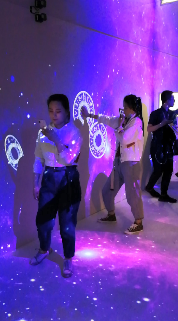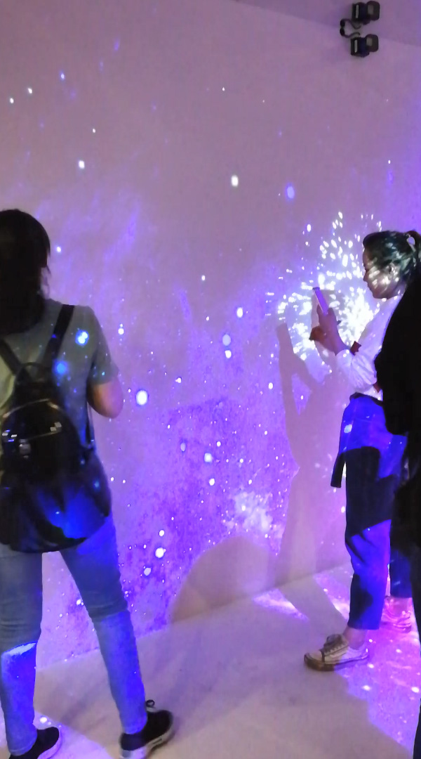 沉浸式互动利用投影机将画面投射到大型或者多面的投影幕上,然后再借助多通道投影融合技术使得画面能够呈现出更好的效果。该系统能够提供一个房间大小的四面(或六面)立方体投影显示空间,再结合音响系统和动作采集系统,制造一个沉浸式的立体三维视听的交互体验感。将影像投射四周墙上和地上,配合3D主题游戏内容,打造3D立体空间,并且与影像的主题内容进行互动,如动物,人物,花草等,让顾客,产生身临其境的感觉,增加了感官体验以及场景互动性