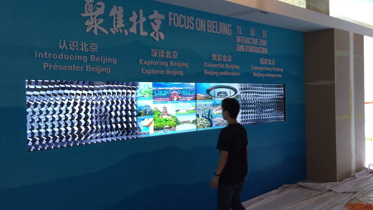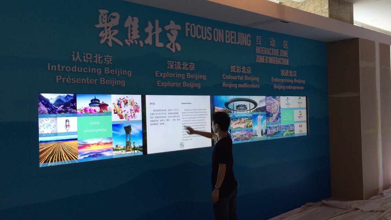 触摸系统自动感应是否有体验人员进入互动区域,没有人的情况下,系统循环播放广告视频或者动态效果演绎、一旦有人进入指定空间后,屏幕自动向两边打开,显示触控界面,系统允许多人同时操作。